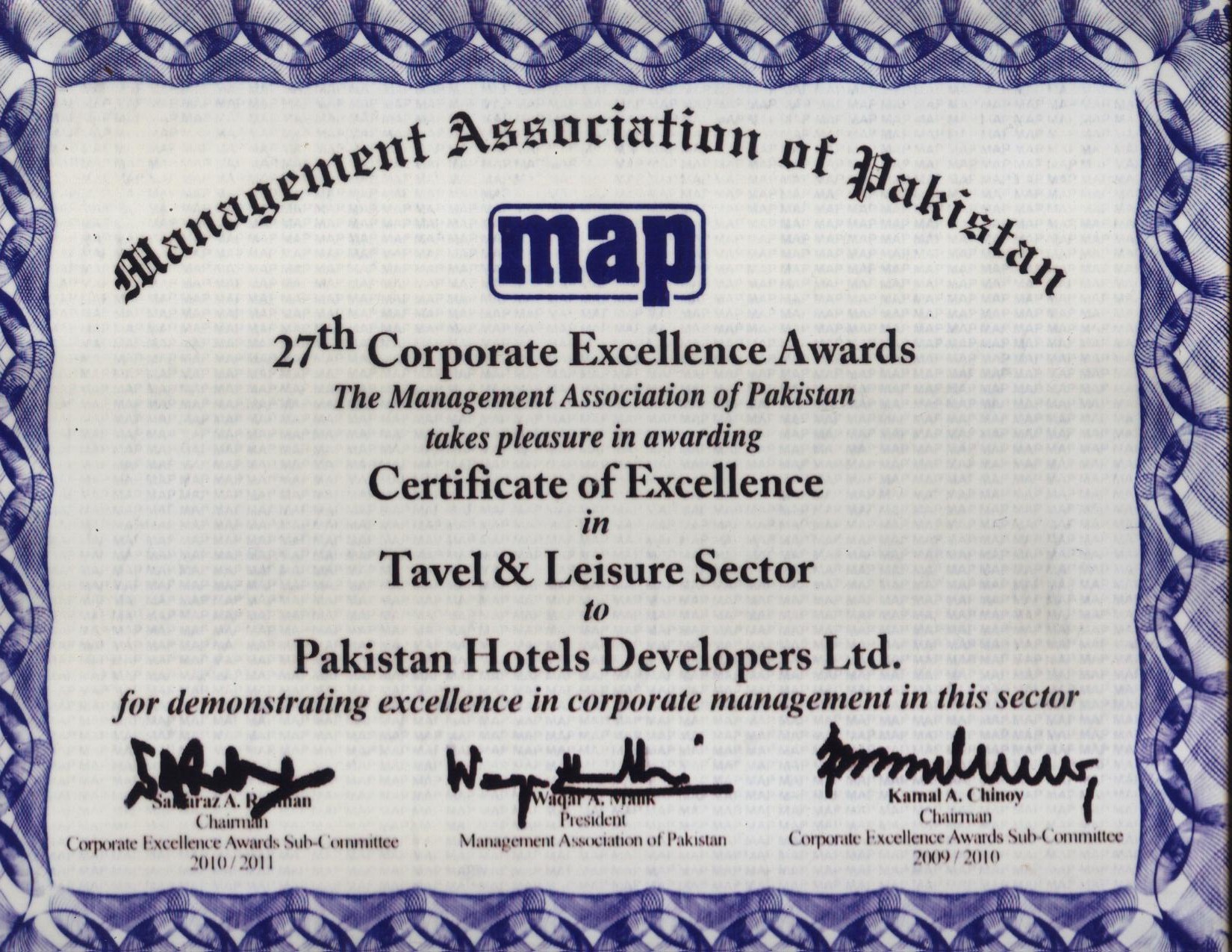 Certificate of Excellence toTravel & Leisure Sector Awarded byManagement Association of Pakistan (MAP)